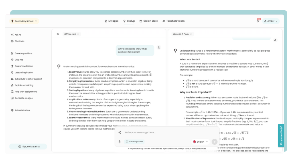 Our unique Side-by-Side AI feature provides users with an unprecedented perspective by allowing them to compare and contrast the responses of multiple leading models, including GPT-4, Mistral, and Gemini, within a single interface. This groundbreaking capability, a global first, empowers educators and students to move beyond the limitations of single-model interactions and cultivate the essential critical thinking skills required for an AI-driven world.