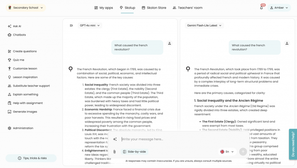 By providing a platform for comparing multiple AI models, Skolup actively combats single-source bias and encourages a more nuanced and critical approach to AI-generated information.
