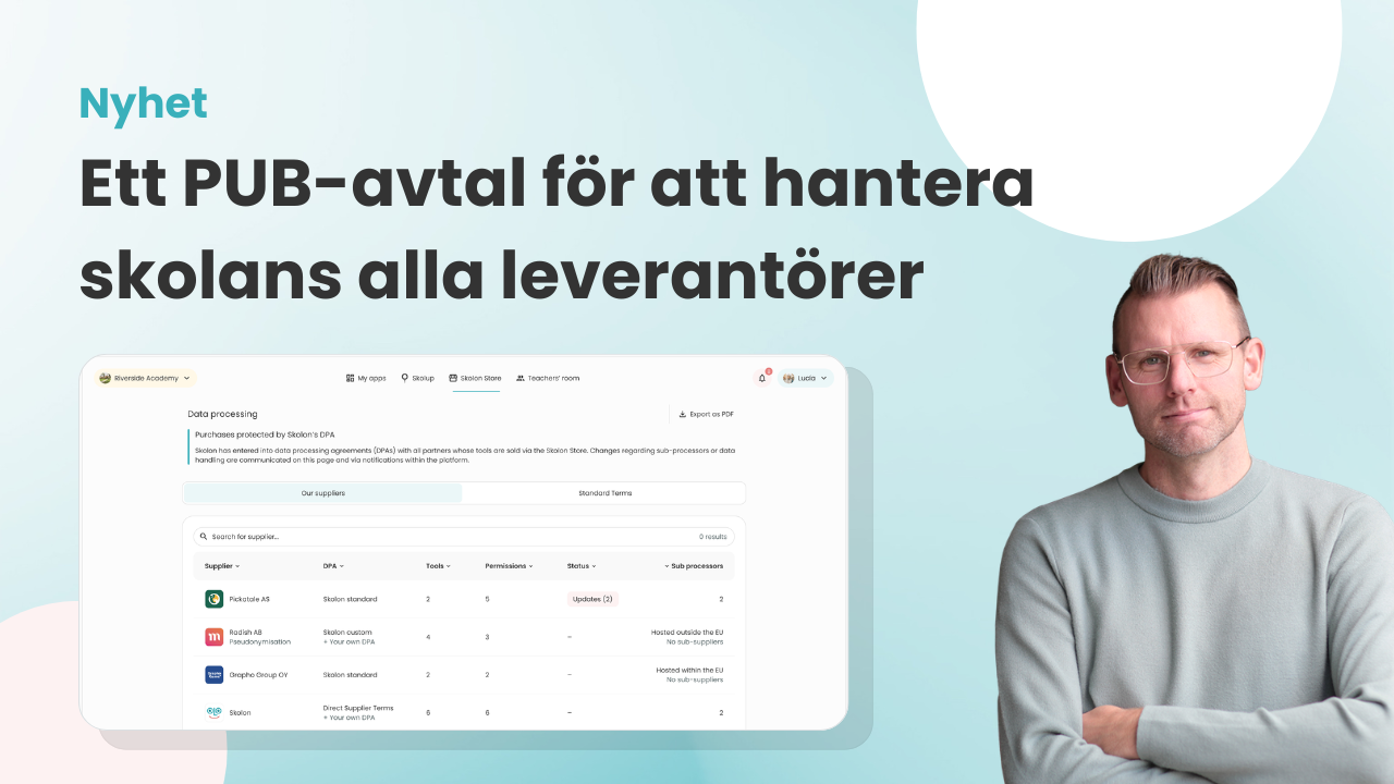 Att hålla koll på alla avtal, leverantörer och hur data hanteras är en utmaning för huvudmän och skolor när det gäller digitala verktyg och läromedel. Med Skolons nya PUB-avtalsfunktion blir det betydligt enklare. Nu samlas all nödvändig leverantörsinformation i en tydlig och samlad översikt och endast ett PUB-avtal krävs  – avtalet med Skolon.