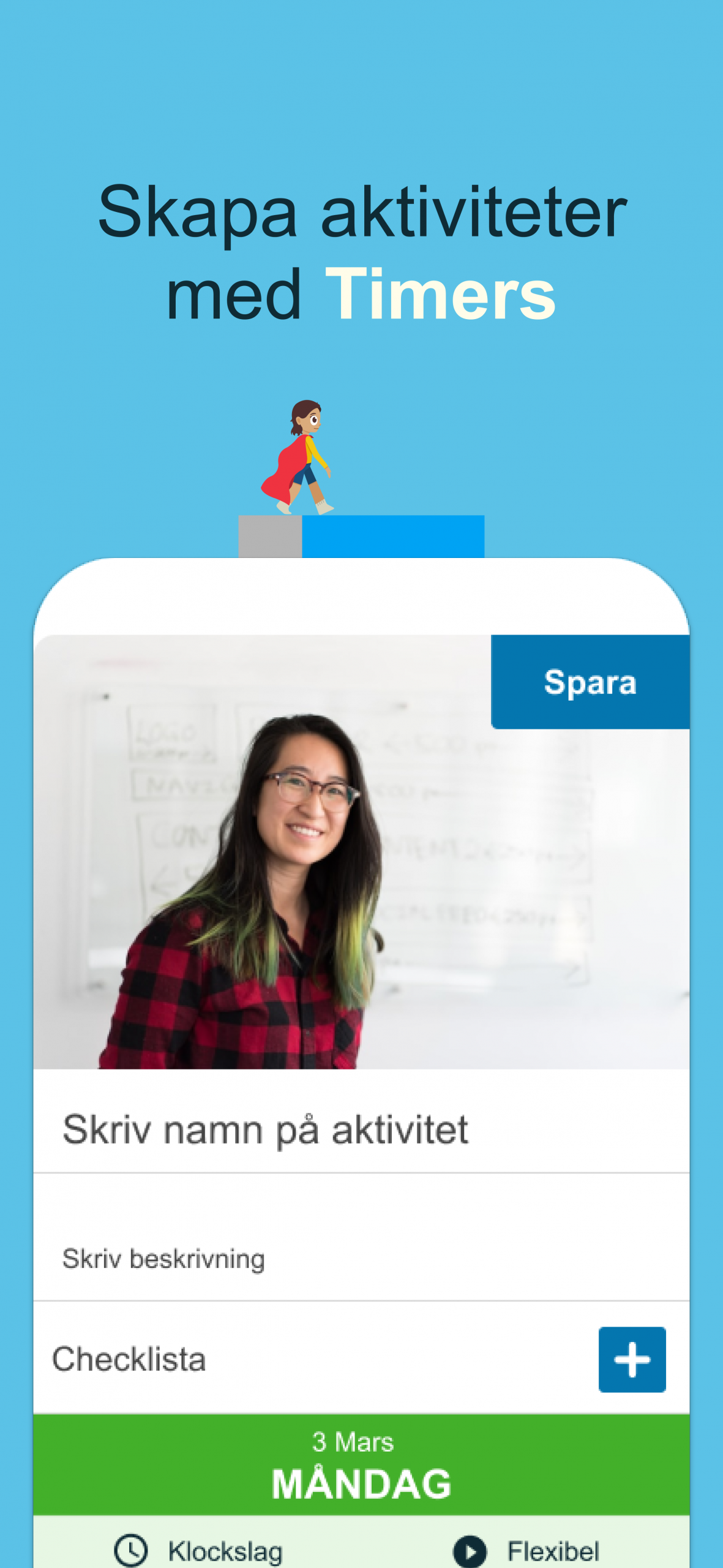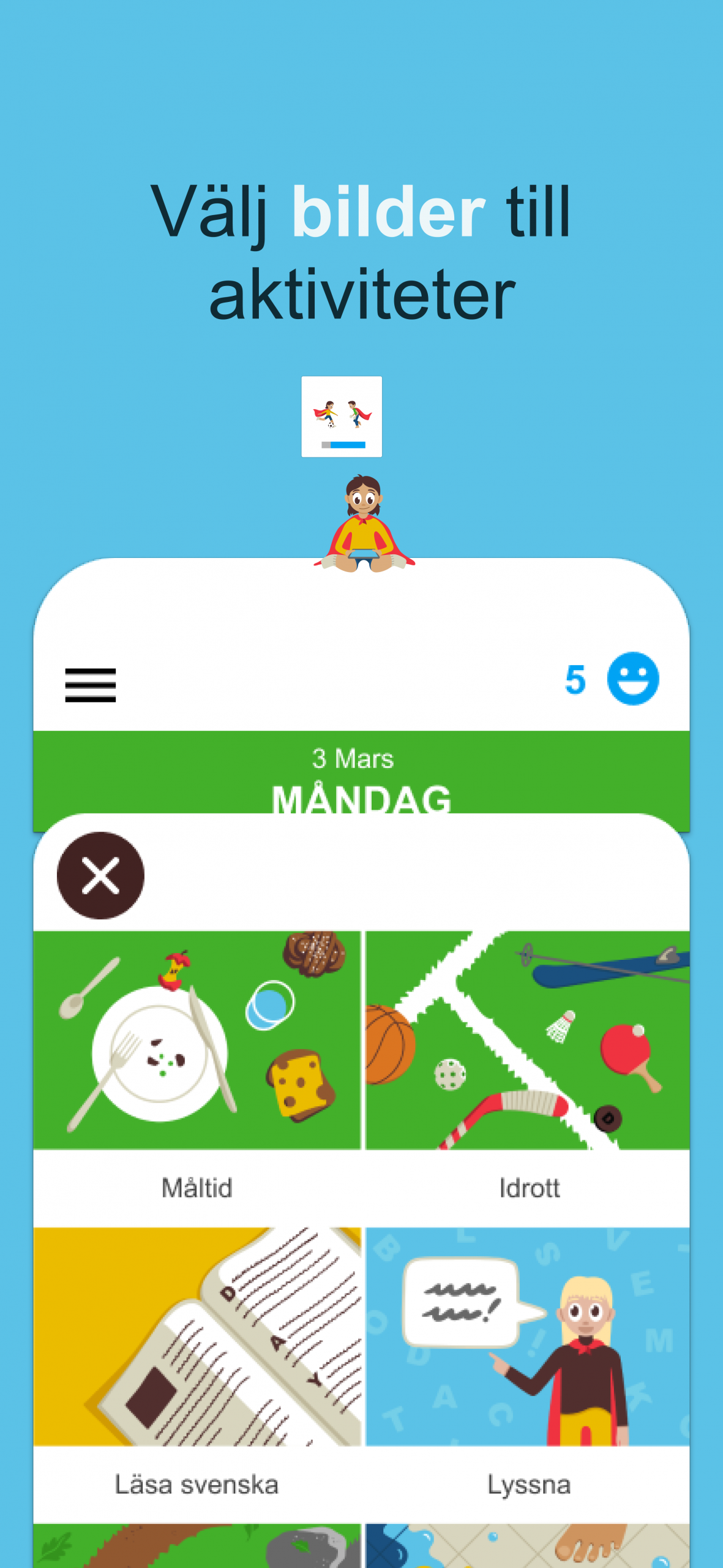 - Enkel schemaläggning: Skapa aktiviteter med bilder från ett färdigt bibliotek.